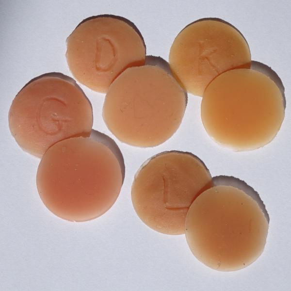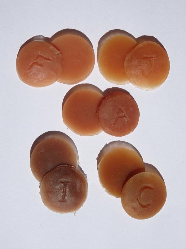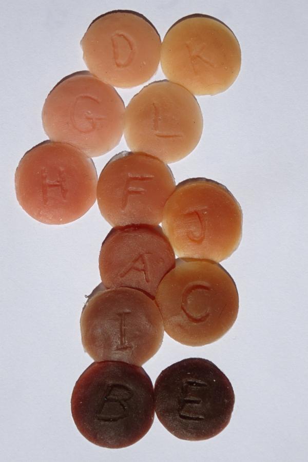 Die hellsten Pigmente (D, K, G und L) sind auf die gleiche Weise angeordnet (jede Pigmentprobe ist von vorne und hinten abgebildet).