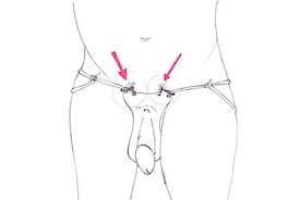 Das Beinband wird an der Rückseite des Hodensacks befestigt, verläuft um die Unterseite jeder Pobacke, an jeder Hüfte hoch und wird dann an jeder Seite mit dem Taillenband verbunden.